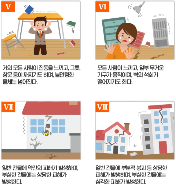 | Ⅵ | 모든 사람이 느끼고, 일부 무거운 가구가 움직이며, 벽의 석회가 떨어지기도 한다. |