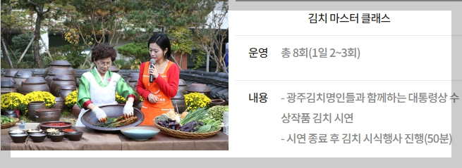 해마다 열리는 ‘대한민국 김치경연대회’와 ‘김치응용요리경연대회’는 전년과 같이 광주김치타운에서 3·4일 각각 진행됩니다.