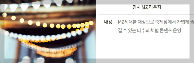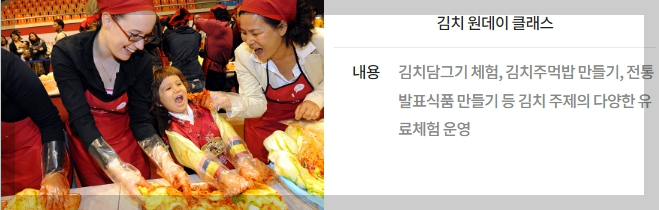 김치명인교실, 김치 담그기 체험, 예술작품 만들기 체험, 김치 MZ라운지 등 김치를 주제로 한 다양한 김치체험 콘텐츠입니다.